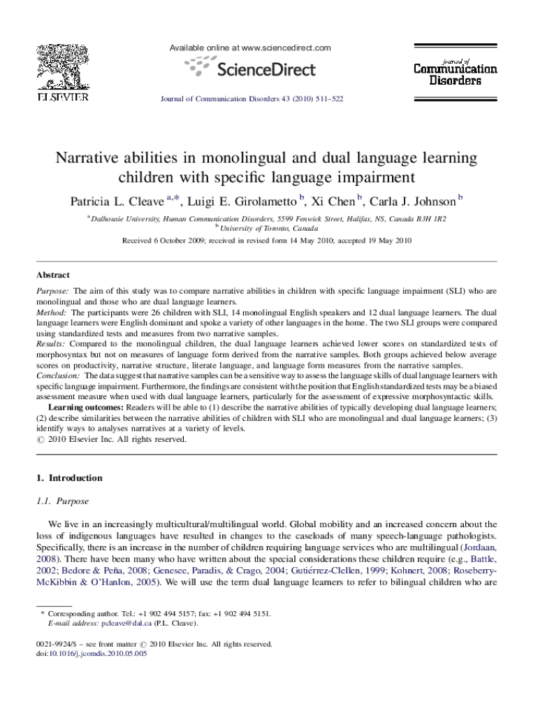 Get the free Narrative abilities in monolingual and dual language learning ...