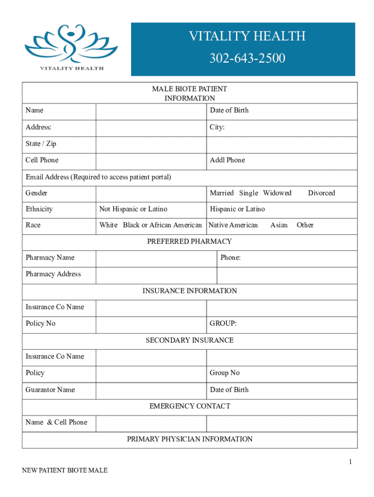 VITALITY HEALTH 3026432500 MALE BIOTE PATIENT INFORMATION NameDate of BirthAddress:City:State / Zip Cell PhoneAddl PhoneEmail Address (Required to access patient portal) GenderMarried Single WidowedEthnicityNot