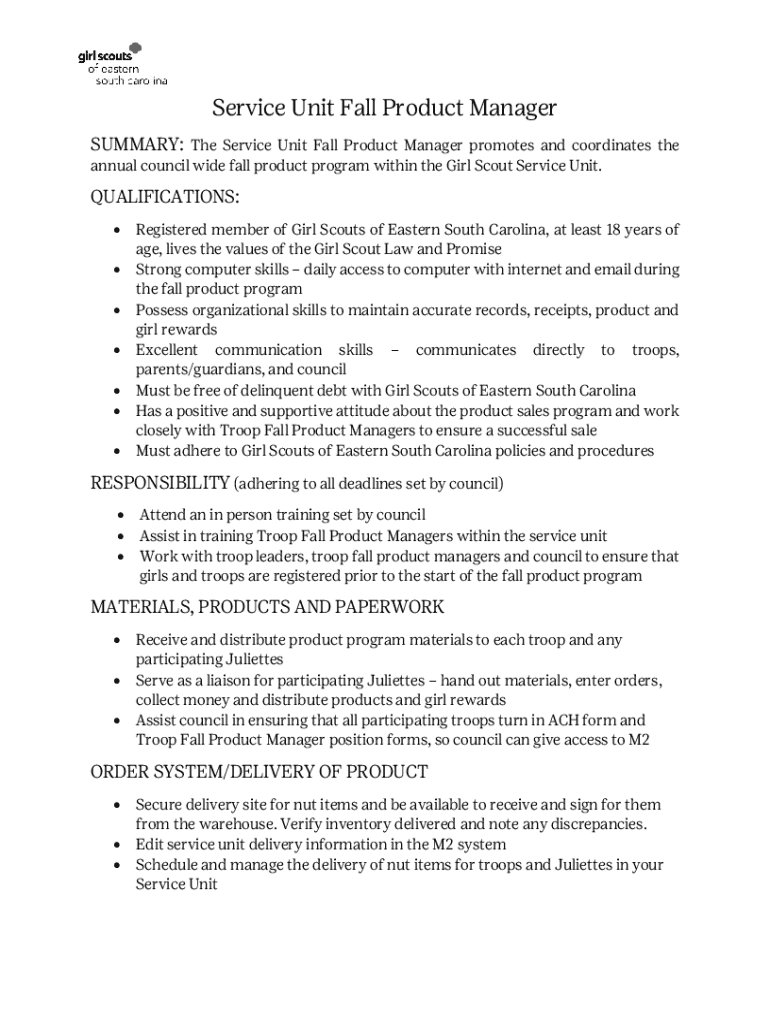 Get the free SERVICE UNIT FALL PRODUCT MANAGER'S GUIDE