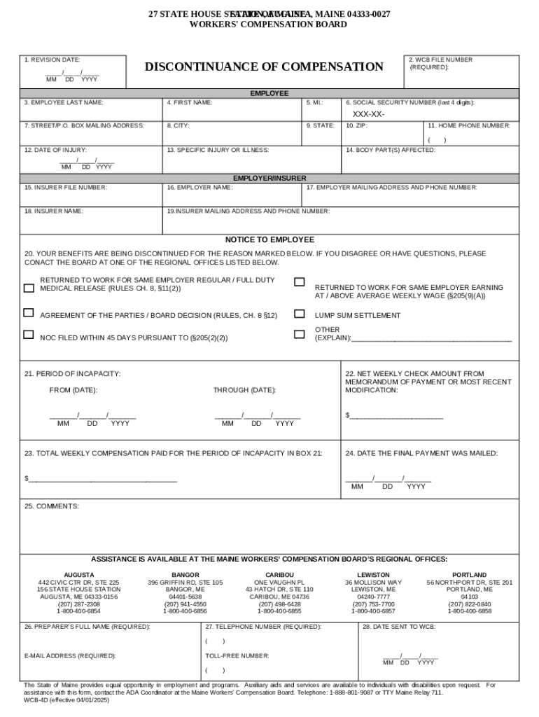 Reason for discontinuance: A clear explanation of why compensation is being discontinued.