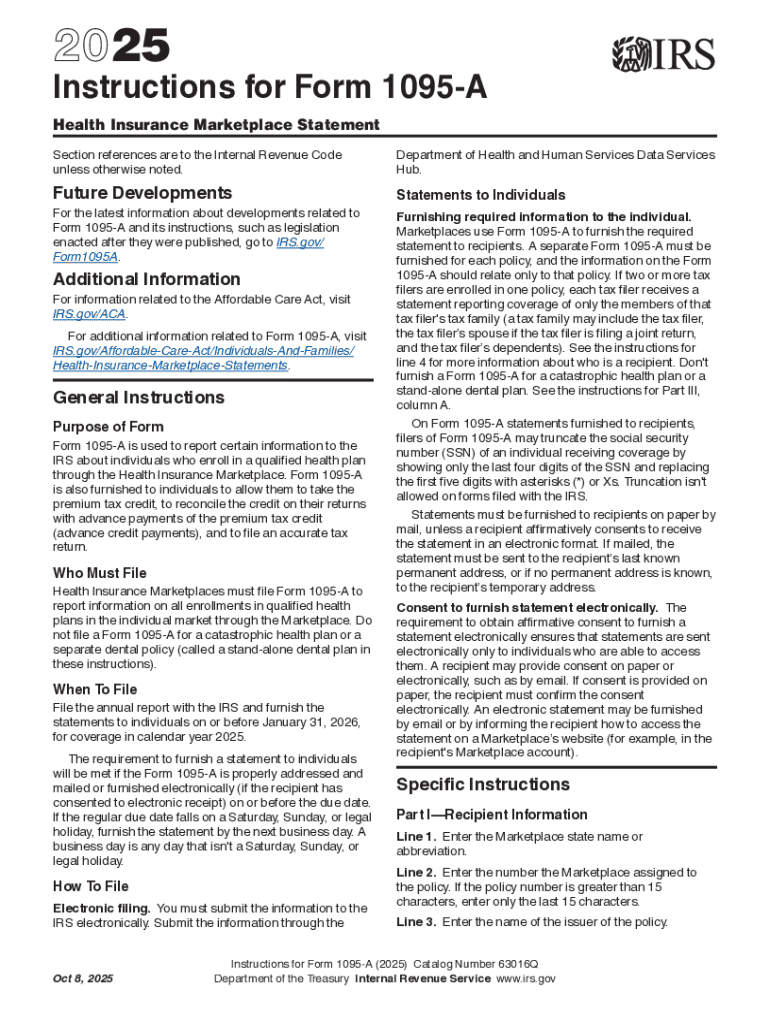 Form 1095-A is an IRS document that you receive if you enrolled in a health plan through the Health Insurance Marketplace. This form provides essential information about your insurance coverage, specifically detailing the months you were covered, the premium amounts, and the premium tax credit available to you. This form is pivotal in determining your health coverage when filing your annual tax return.