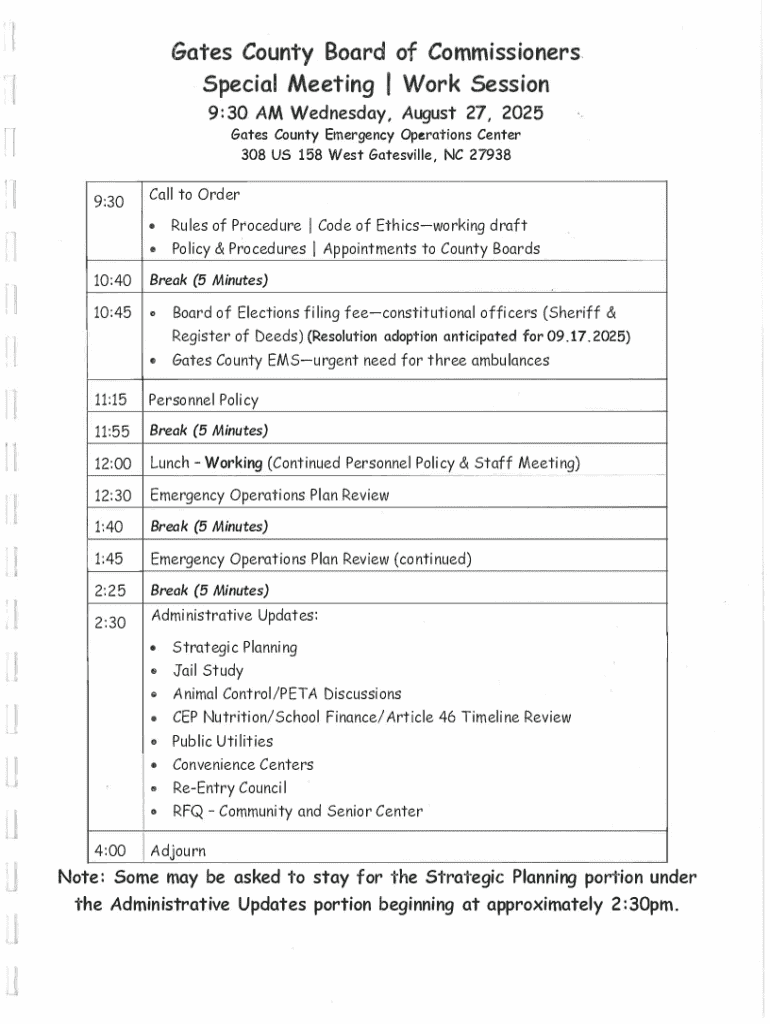 Gates County Board of Commissioners. Special Meeting I Work Session 9: 30 AM Wednesday, August 27, 2025 Gates County Emergency Operations Center 308 US 158 West Gatesville, NC 279389:30ICal I to Order