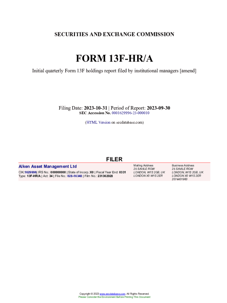 Get the free Alken Asset Management Ltd Form 13F-HR/A Filed 2023-10-31. Accession Number