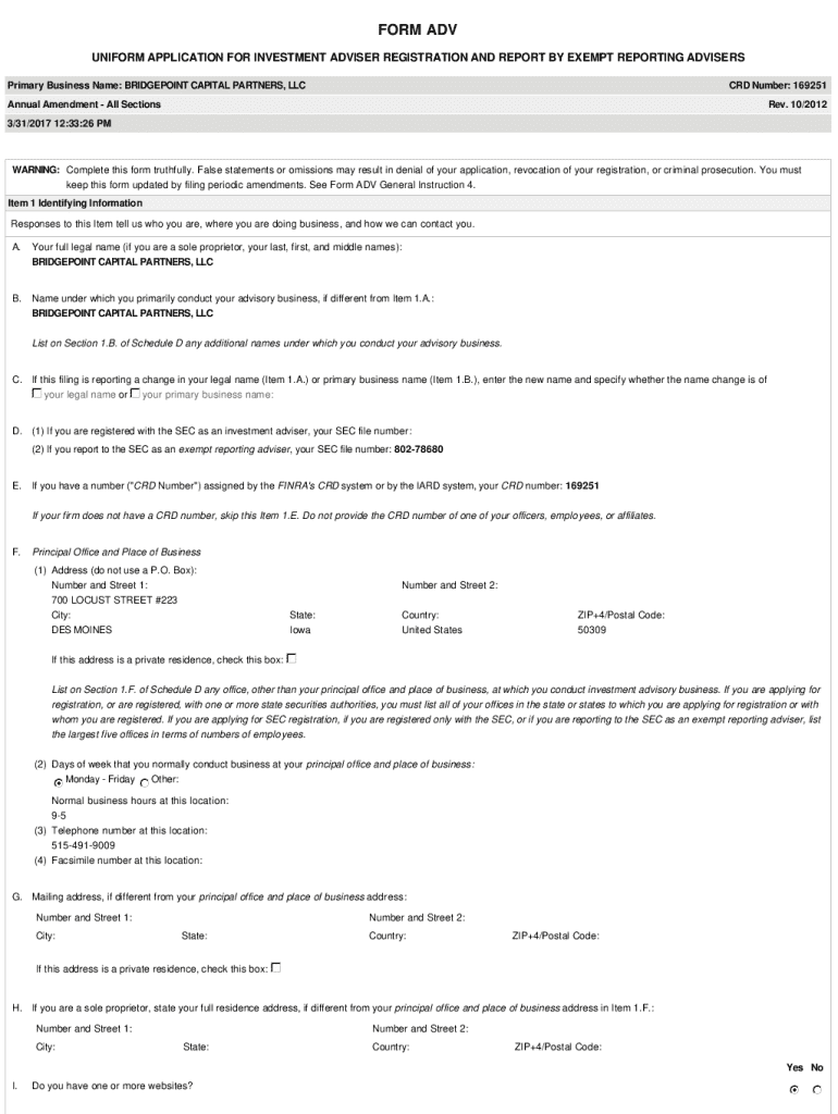FORM ADV UNIFORM APPLICATION FOR INVESTMENT ADVISER REGISTRATION AND REPORT BY EXEMPT REPORTING ADVISERS Primary Business Name: BRIDGEPOINT CAPITAL PARTNERS, LLCCRD Number: 169251Annual AmendmentAll