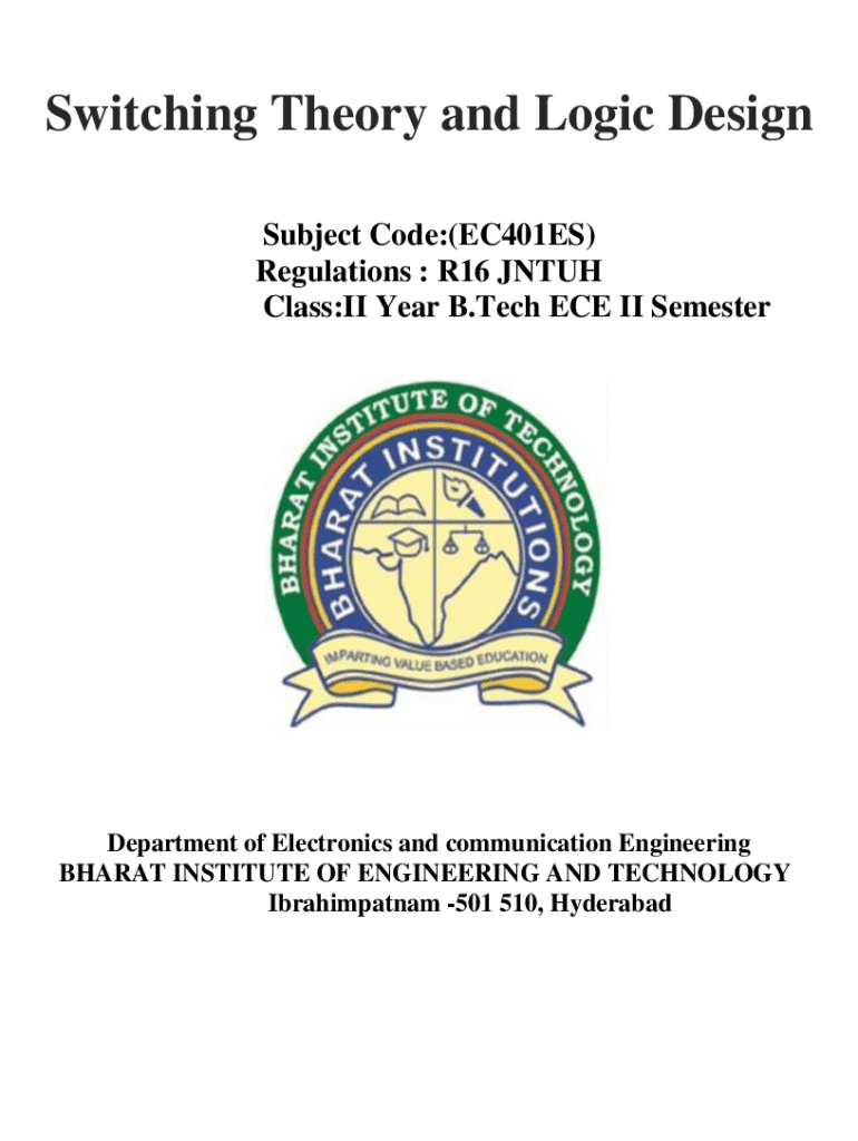 Switching Theory and Logic Design Subject Code:(EC401ES) Regulations : R16 JNTUH Class:II Year B.Tech ECE II SemesterDepartment of Electronics and communication Engineering BHARAT INSTITUTE OF ENGINEERING