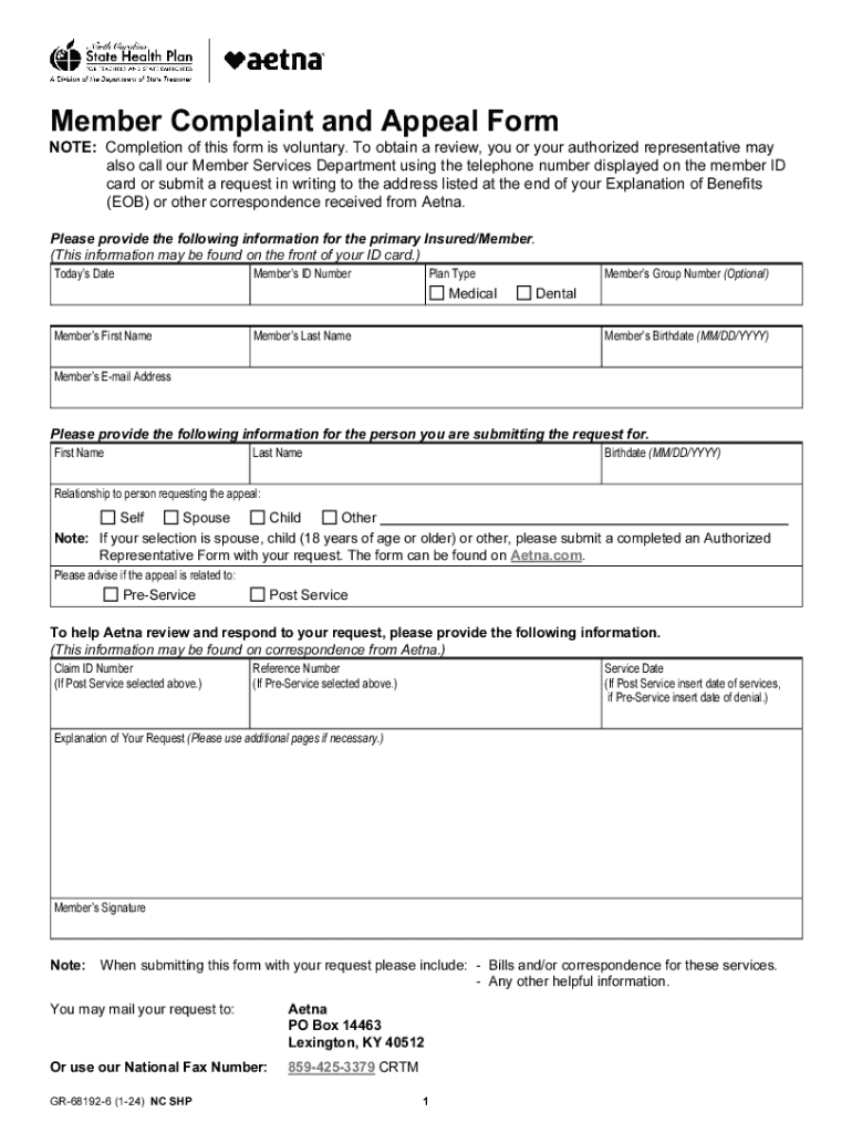 Get the free North Carolina State Health Plan / Aetna - Member Complaint and Appeal Form. Accessi...