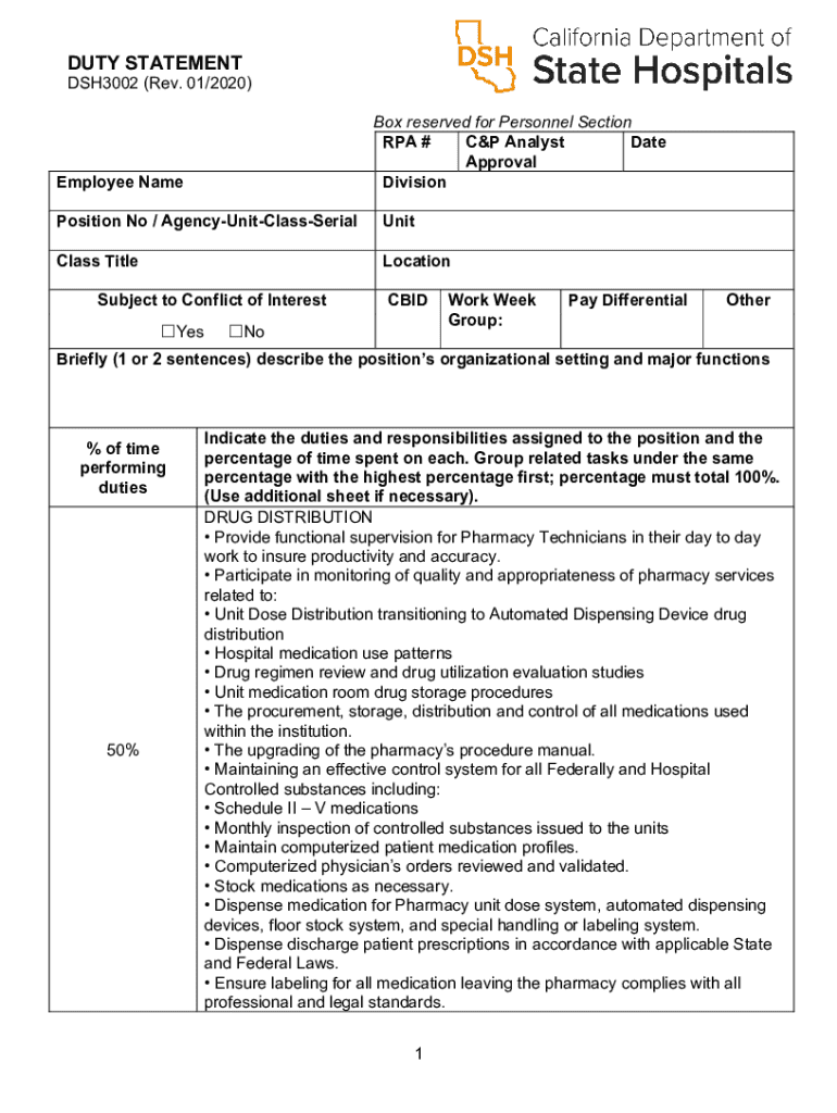 DUTY STATEMENTDSH3002 (Rev. 01/2020)Employee NameBox reserved for Personnel Section RPA # C&P Analyst Date Approval DivisionPosition No / AgencyUnitClassSerialUnitClass TitleLocationSubject to Conflict