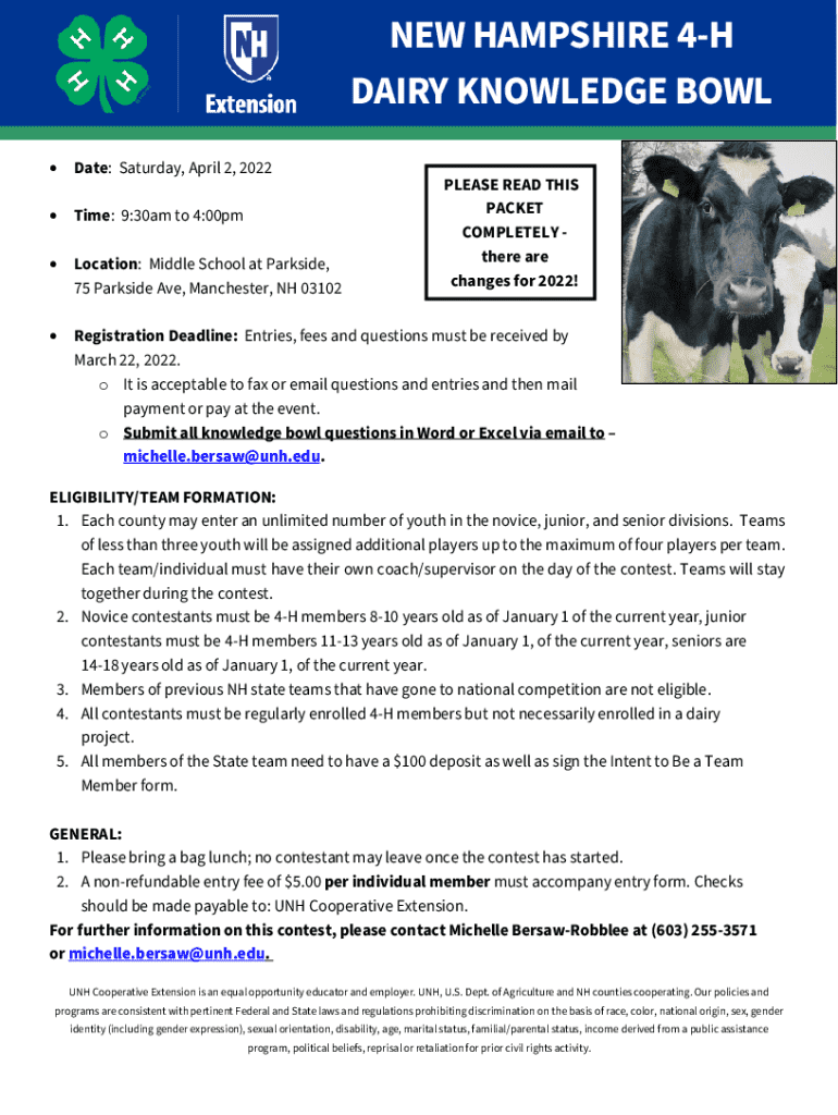 NEW HAMPSHIRE 4H DAIRY KNOWLEDGE BOWL Date: Saturday, April 2, 2022Time: 9:30am to 4:00pmLocation: Middle School at Parkside, 75 Parkside Ave, Manchester, NH 03102Registration Deadline: Entries, fees