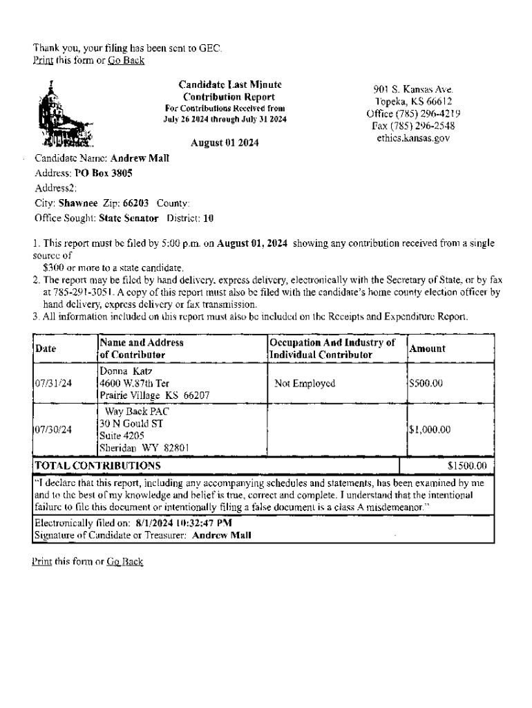 Thank you, your filing has been sent to GEC. Print this form or Go Back Candidate Last Minute Contribution Report For Contributions Received from July 26 2024 through July 31 2024August 01 2024901