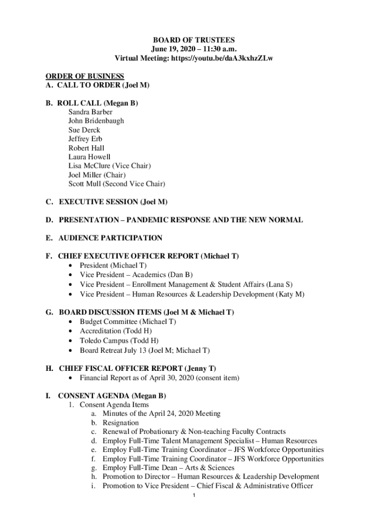 BOARD OF TRUSTEES June 19, 202011:30 a.m. Virtual Meeting: https://youtu.be/daA3kxhzZLw ORDER OF BUSINESS A. CALL TO ORDER (Joel M) B. ROLL CALL (Megan B) Sandra Barber John Bridenbaugh Sue Derck
