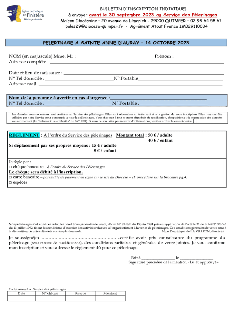 Obtenir le gratuit Bulletin d'inscription - Le Diocse de Quimper et Lon