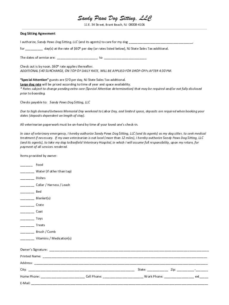 The primary purpose of the Sandy Paws Form is to gather necessary details about the pet and the service required, serving as a communication bridge between pet owners and service providers. Key components typically found in the form include the owner's contact information, pet details (such as breed, age, and health considerations), selected services (like grooming or walking), and any special instructions relevant to their care.