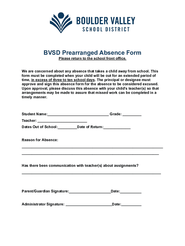 Obtain the BVSD prearranged absence form from the school office or the school website.
