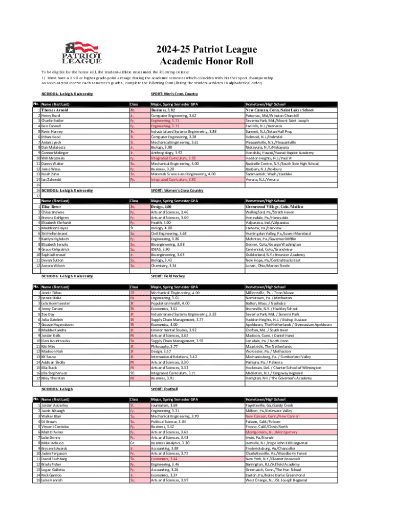 202425 Patriot League Academic Honor Roll To be eligible for the honor roll, the studentathlete must meet the following criteria: 1) Must have a 3.20 or higher gradepoint average during the academic