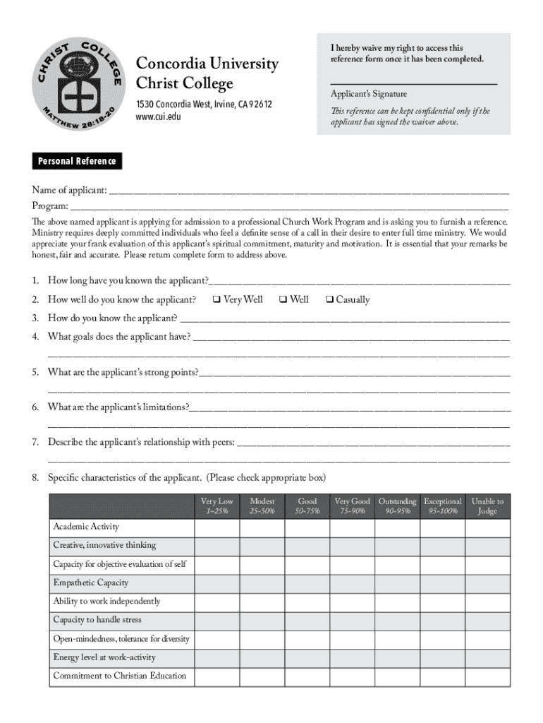 I hereby waive my right to access this reference form once it has been completed.Concordia University Christ CollegeApplicants Signature1530 Concordia West, Irvine, CA 92612 www.cui.eduThis reference