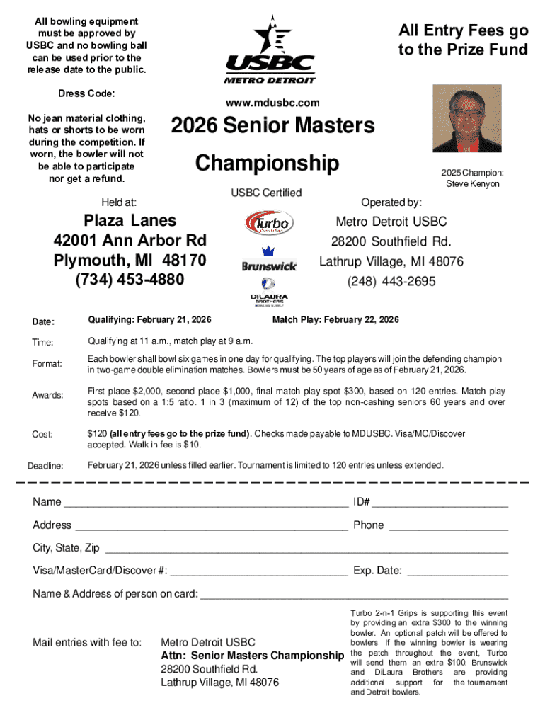 All bowling equipment must be approved by USBC and no bowling ball can be used prior to the release date to the public.All Entry Fees go to the Prize FundDress Code: No jean material clothing, hats