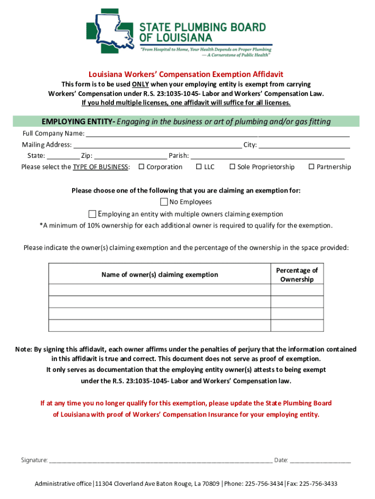 Louisiana Workers Compensation Exemption Affidavit This form is to be used ONLY when your employing entity is exempt from carrying Workers Compensation under R.S. 23:10351045 Labor and Workers Compensation