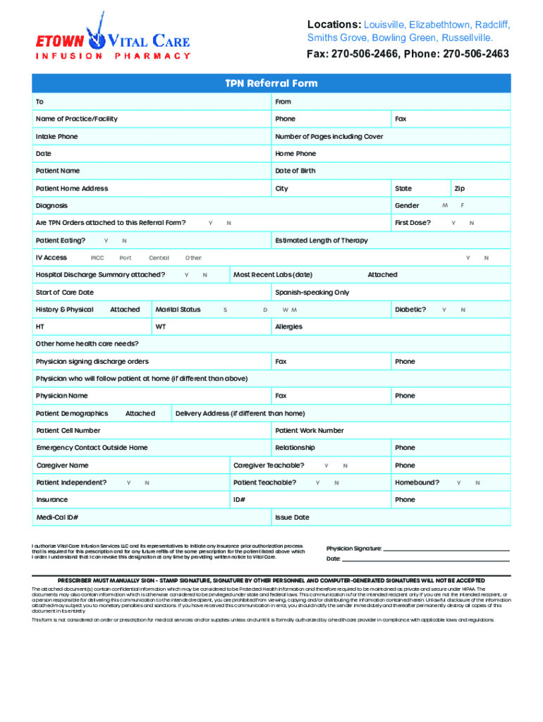 Locations: Louisville, Elizabethtown, Radcliff, Smiths Grove, Bowling Green, Russellville.Fax: 2705062466, Phone: 2705062463 TPN Referral Form ToFromName of Practice/FacilityPhoneIntake PhoneNumber