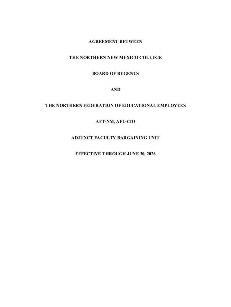 AGREEMENT BETWEEN THE NORTHERN NEW MEXICO COLLEGE BOARD OF REGENTS AND THE NORTHERN FEDERATION OF EDUCATIONAL EMPLOYEES AFTNM, AFLCIO ADJUNCT FACULTY BARGAINING UNIT EFFECTIVE THROUGH JUNE 30, 2026TABLE