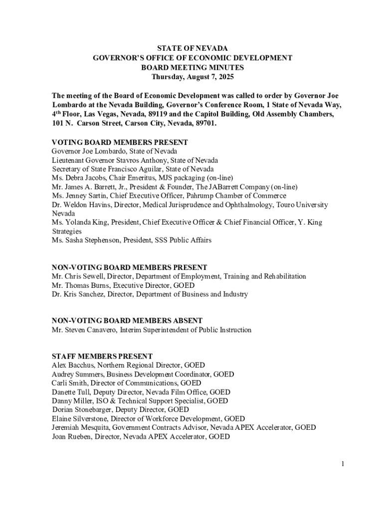 STATE OF NEVADA GOVERNORS OFFICE OF ECONOMIC DEVELOPMENT BOARD MEETING MINUTES Thursday, August 7, 2025 The meeting of the Board of Economic Development was called to order by Governor Joe Lombardo