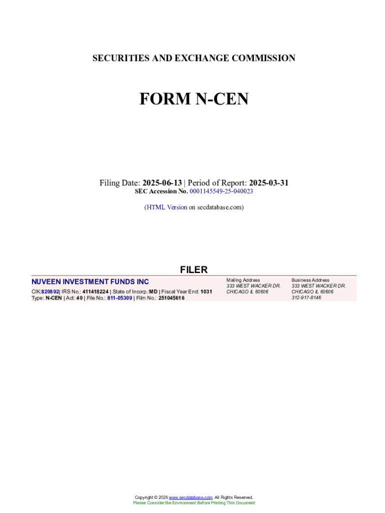 SECURITIES AND EXCHANGE COMMISSIONFORM NCENFiling Date: 20250613 | Period of Report: 20250331 SEC Accession No. 000114554925040023 (HTML Version on secdatabase.com)FILER NUVEEN INVESTMENT FUNDS INC