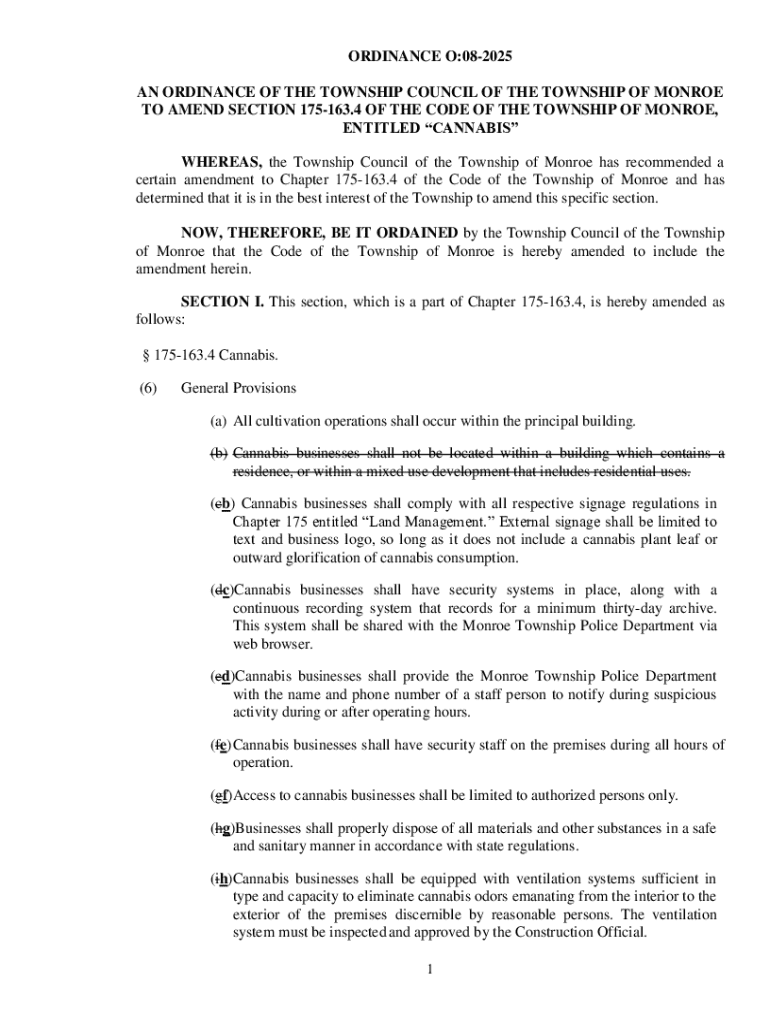 ORDINANCE O:082025 AN ORDINANCE OF THE TOWNSHIP COUNCIL OF THE TOWNSHIP OF MONROE TO AMEND SECTION 175163.4 OF THE CODE OF THE TOWNSHIP OF MONROE, ENTITLED CANNABIS WHEREAS, the Township Council of