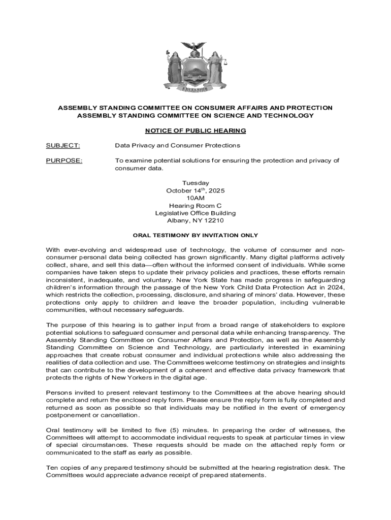 Get the free Notice of Public Hearing - Data Privacy and Consumer ...