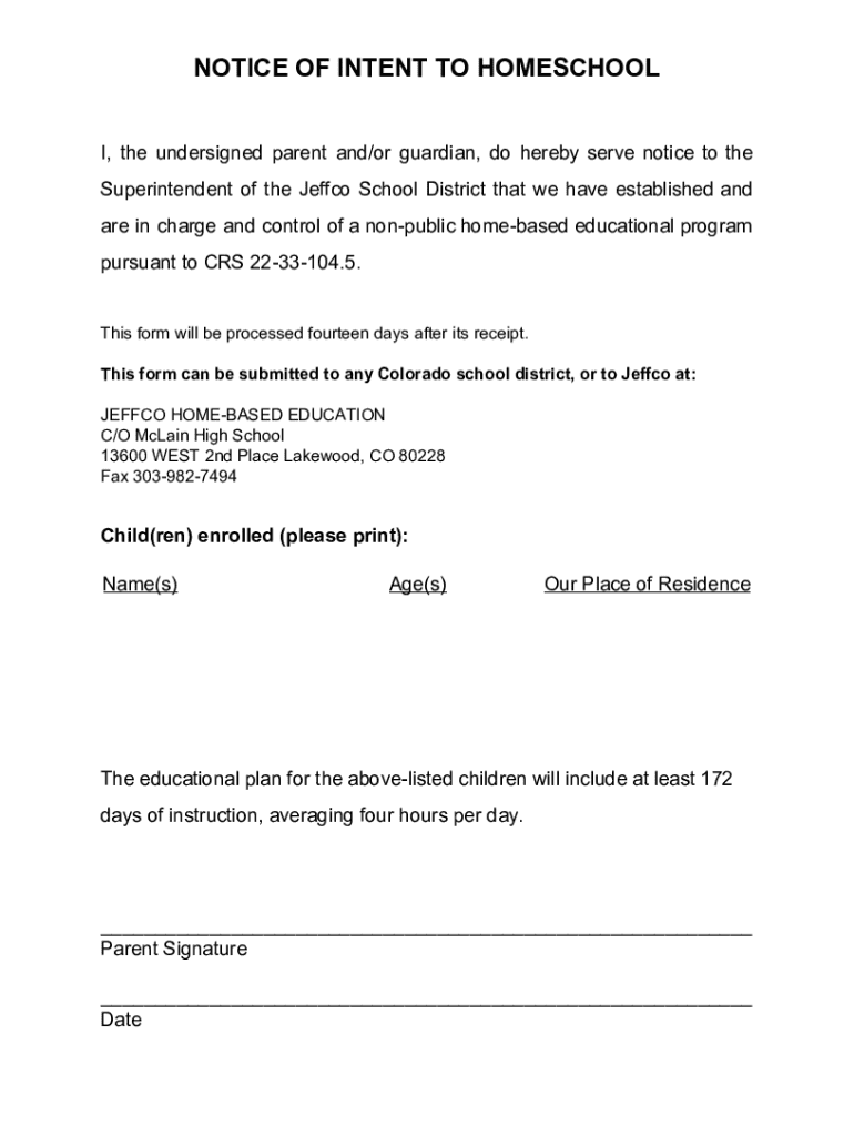 NOTICE OF INTENT TO HOMESCHOOL I, the undersigned parent and/or guardian, do hereby serve notice to the Superintendent of the Jeffco School District that we have established and are in charge and