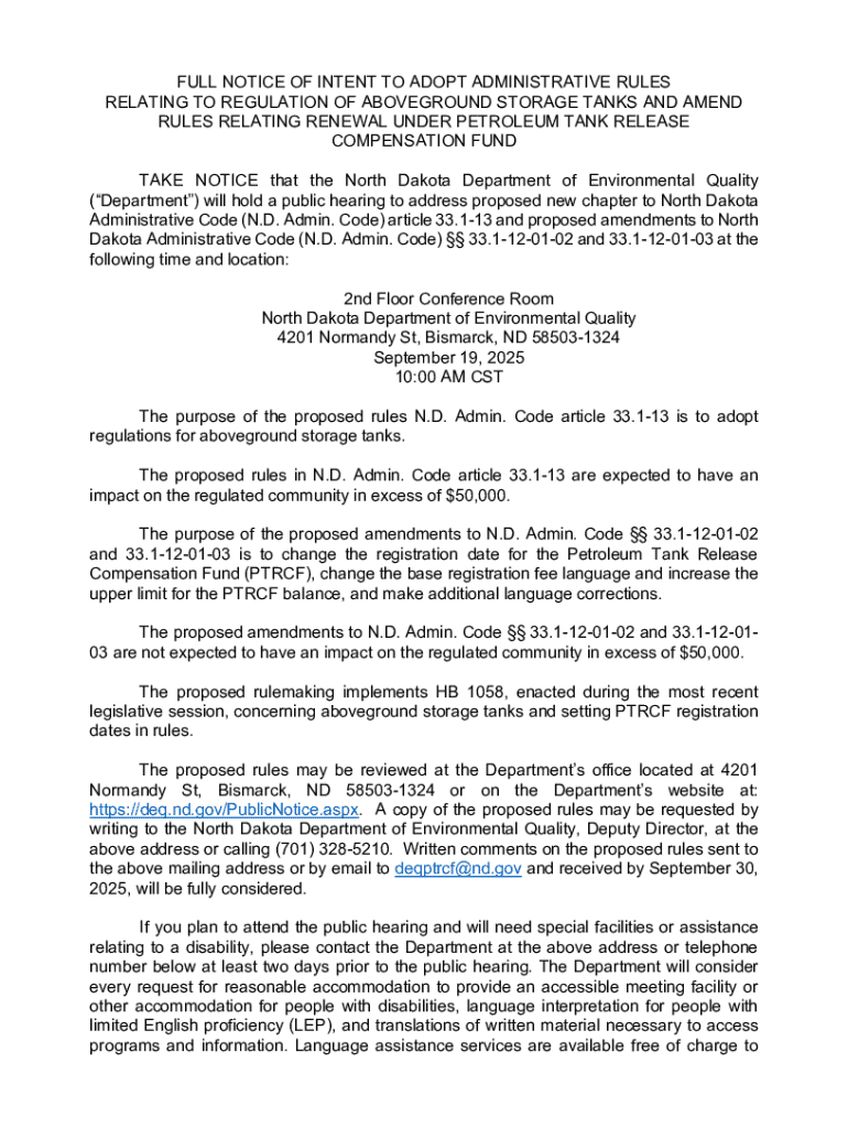 FULL NOTICE OF INTENT TO ADOPT ADMINISTRATIVE RULES RELATING TO REGULATION OF ABOVEGROUND STORAGE TANKS AND AMEND RULES RELATING RENEWAL UNDER PETROLEUM TANK RELEASE COMPENSATION FUND TAKE NOTICE