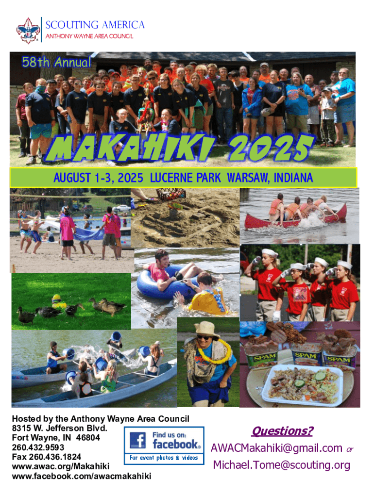 SCOUTING AMERICA ANTHONY WAYNE AREA COUNCIL58th AnnualMAKAHIKI 2025 AUGUST 13, 2025 LUCERNE PARK WARSAW, INDIANAHosted by the Anthony Wayne Area Council 8315 W. Jefferson Blvd. Fort Wayne, IN 46804