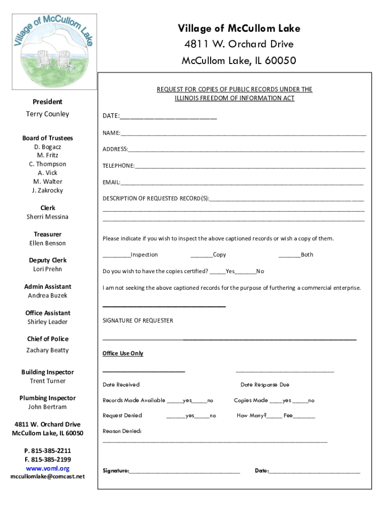 Village of McCullom Lake 4811 W. Orchard Drive McCullom Lake, IL 60050Mr.REQUEST FOR COPIES OF PUBLIC RECORDS UNDER THE ILLINOIS FREEDOM OF INFORMATION ACTPresident Terry Counley Board of Trustees