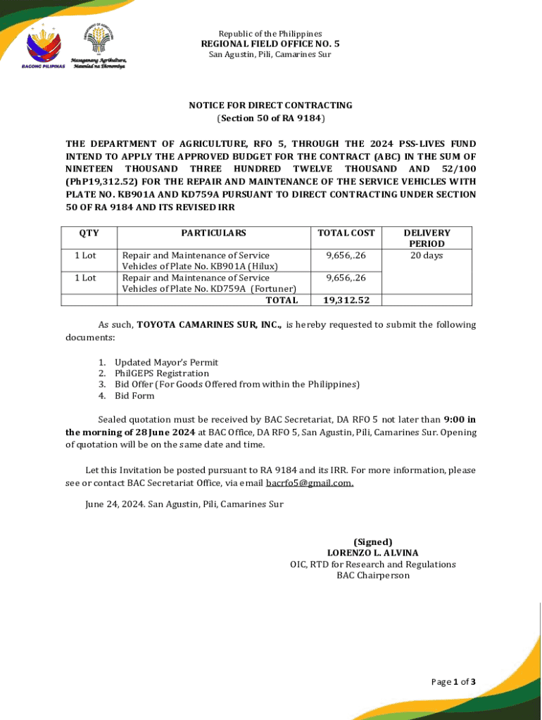 Get the free notice for direct contracting - DA Regional Field Office 5 - bicol da gov