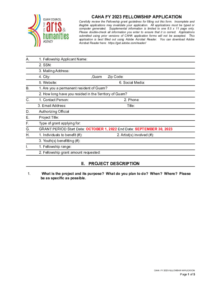 GUAM COUNCIL ON THE ARTS & HUMANITIES AGENCY Kahan I Kutturan Guhan P.O. Box 2950 Hagta, Guam 96932 Tel. (671) 30012048 / Email: info@caha.guam.gov (INQUIRIES ONLY, grants@caha.guam.gov (GRANT APPLICATIONS