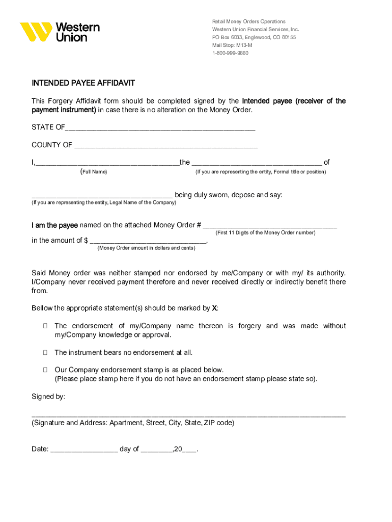 Retail Money Orders Operations Western Union Financial Services, Inc. PO Box 6033, Englewood, CO 80155 Mail Stop: M13M 18009999660INTENDED PAYEE AFFIDAVIT This Forgery Affidavit form should be completed