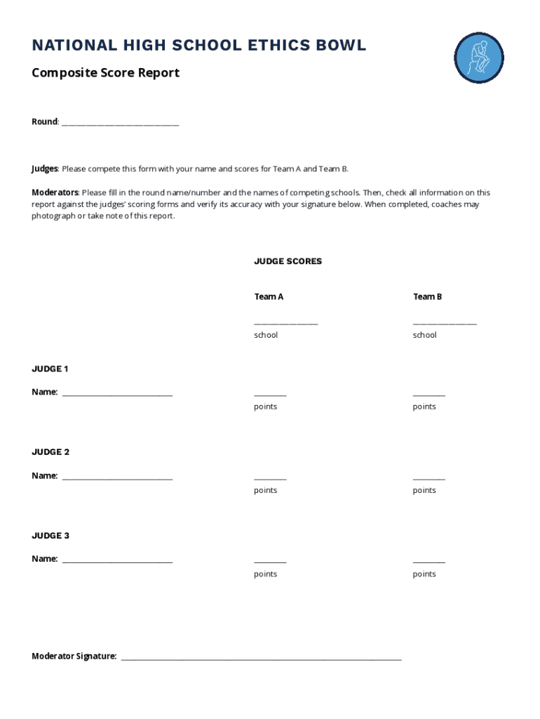 NATIONAL HIGH SCHOOL ETHICS BOWL Composite Score ReportRound: ___Judges: Please compete this form with your name and scores for Team A and Team B. Moderators: Please ll in the round name/number and