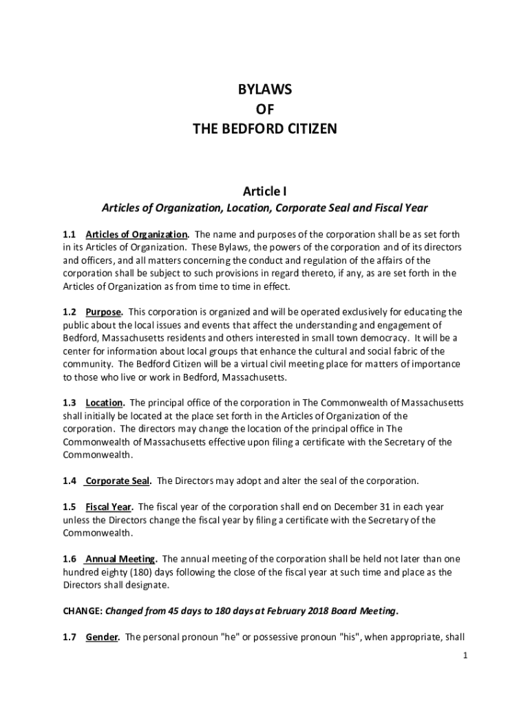 BYLAWS OF THE BEDFORD CITIZENArticle IArticles of Organization, Location, Corporate Seal and Fiscal Year 1.1 Articles of Organization. The name and purposes of the corporation shall be as set forth
