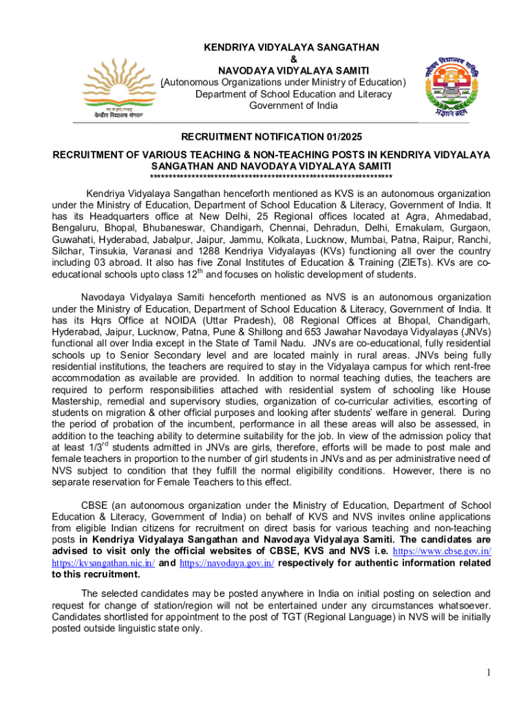 The Kendriya Vidyalaya Sangathan (KVS) is a prominent organization under the Government of India that manages a system of centrally funded schools across the country. The Notifications Recruitment KVS Form is essential for any candidate aspiring to join the KVS system. This form represents the first crucial step in the recruitment process. It outlines job openings, eligibility criteria, and application procedures, serving as a gateway for potential educators and administrative staff to become part of this esteemed institution. Keeping track of key deadlines and timelines around submissions ensures that candidates do not miss out on opportunities that could define their careers.