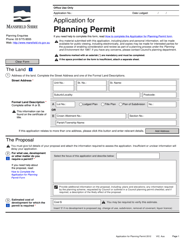 Office Use Only Application No.: Date Lodged: / / Application for Planning Permit Planning Inquiries Phone: 03 5775 8555 Web: http://www.mansfield.vic.gov.au If you need help to complete this form,