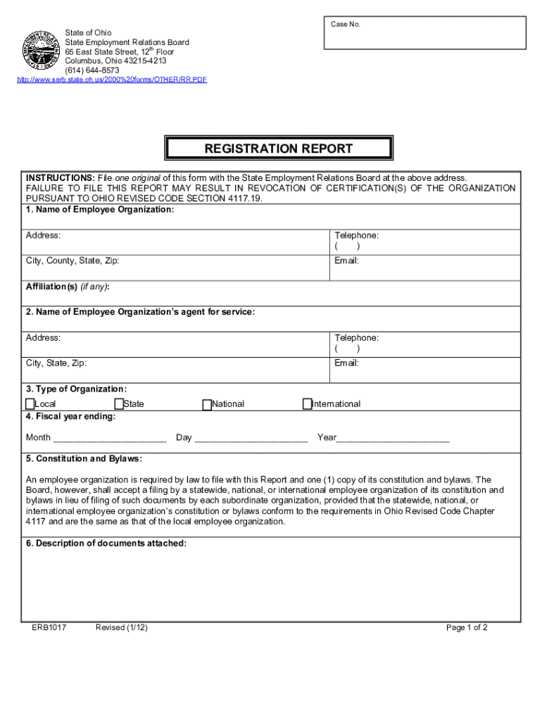 Case No.State of Ohio State Employment Relations Board 65 East State Street, 12th Floor Columbus, Ohio 432154213 (614) 6448573 http://www.serb.state.oh.us/2000%20forms/OTHER/RR.PDFREGISTRATION REPORT