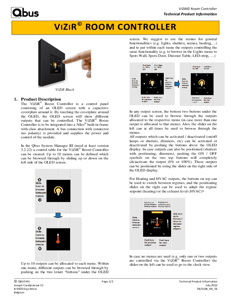 ViZiR Room ControllerTechnical Product InformationV I Z I RROOM CONTROLLER screen. We suggest to use the menus for general functionalities (e.g. lights, shutters, scenes, heating,) and to put within