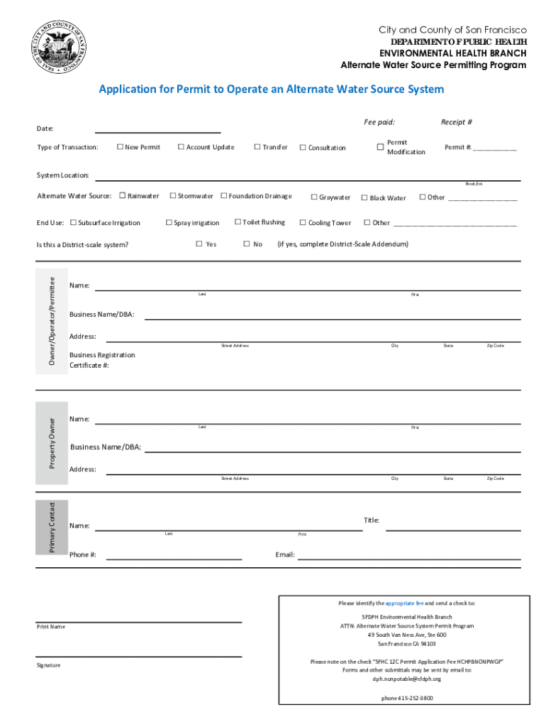 City and County of San Francisco DEPARTMENT OF PUBLIC HEALTH ENVIRONMENTAL HEALTH BRANCH Alternate Water Source Permitting ProgramApplication for Permit to Operate an Alternate Water Source System