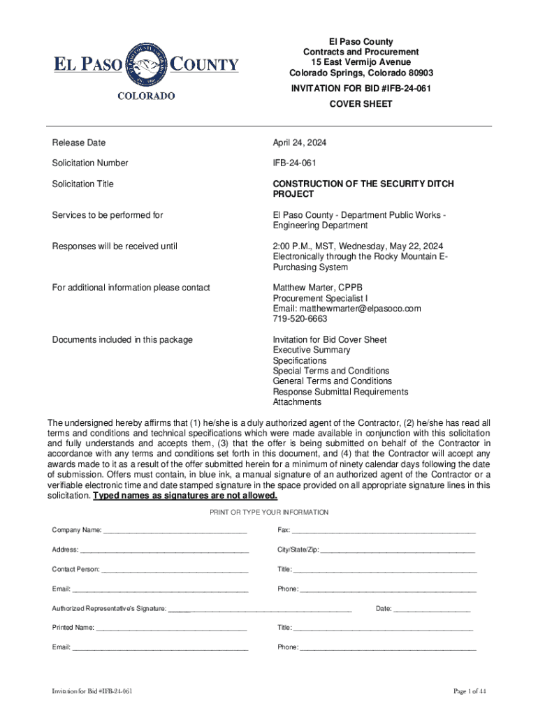 El Paso County Contracts and Procurement 15 East Vermijo Avenue Colorado Springs, Colorado 80903 INVITATION FOR BID #IFB24061 COVER SHEETRelease DateApril 24, 2024Solicitation NumberIFB24061Solicitation