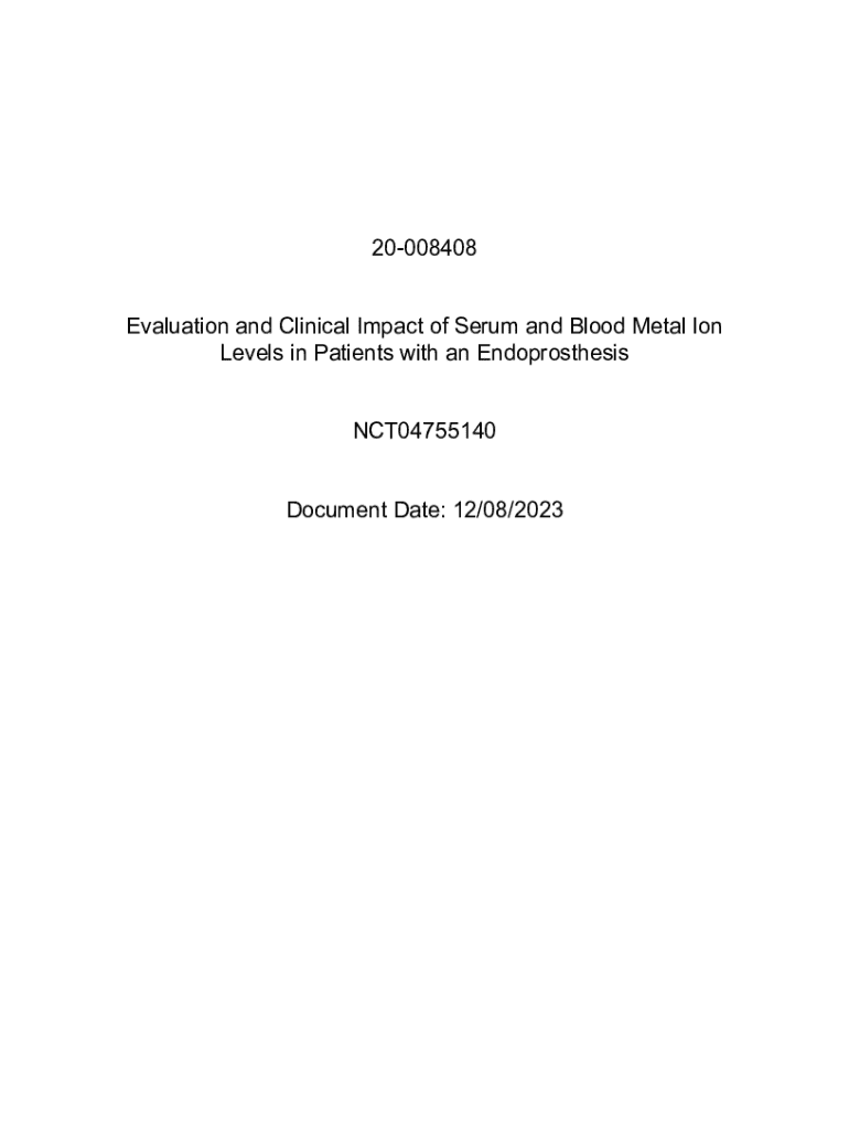 20008408 Evaluation and Clinical Impact of Serum and Blood Metal Ion Levels in Patients with an Endoprosthesis NCT04755140 Document Date: 12/08/2023Name and Clinic NumberApproval Date: December 8,