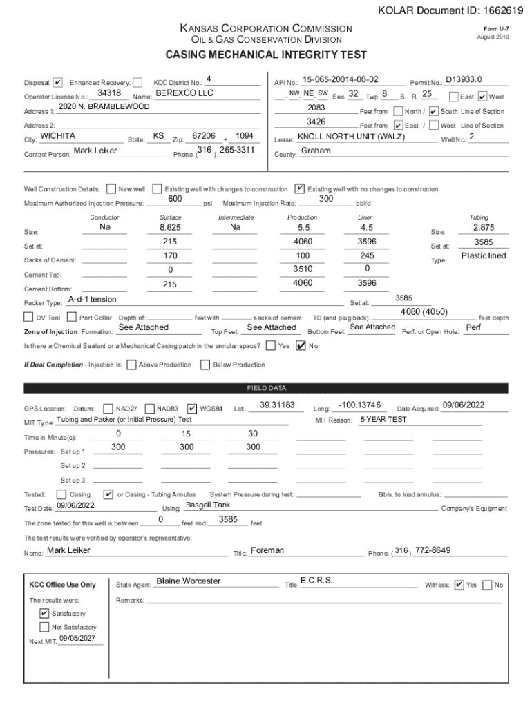 KOLAR Document ID: 1662619K ANSAS CORPORATION COMMISSIONForm U7 August 2019OIL & GAS CONSERVATION DIVISION CASING MECHANICAL INTEGRITY TEST Disposal: Enhanced Recovery:34318Operator License No.:4KCC