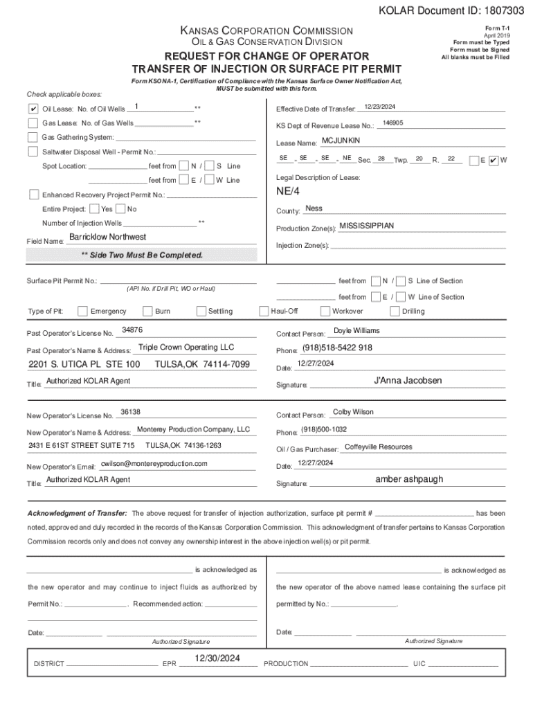 KOLAR Document ID: 1807303K ANSAS CORPORATION COMMISSIONForm T1 April 2019 Form must be Typed Form must be Signed All blanks must be FilledOIL & GAS CONSERVATION DIVISION REQUEST FOR CHANGE OF OPERATOR