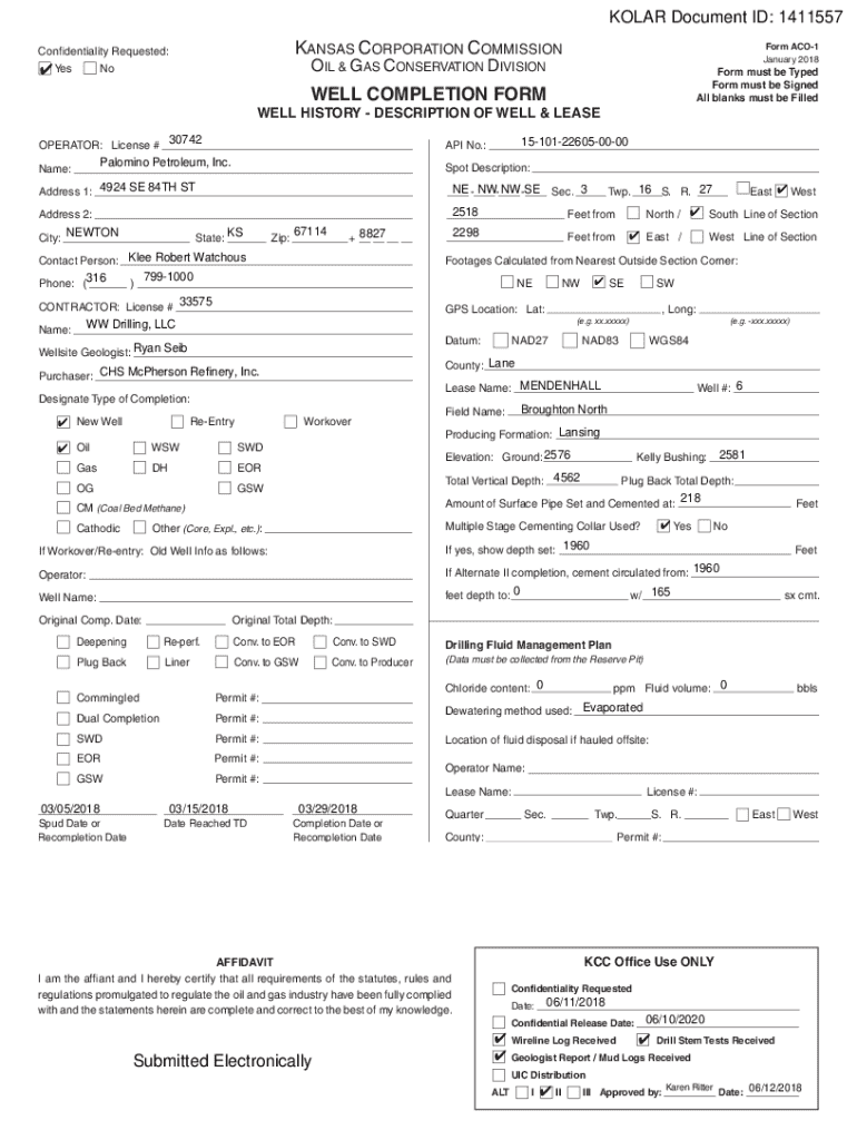 KOLAR Document ID: 1411557KANSAS CORPORATION COMMISSIONConfidentiality Requested: Yes NoForm ACO1 January 2018OIL & GAS CONSERVATION DIVISIONForm must be Typed Form must be Signed All blanks must