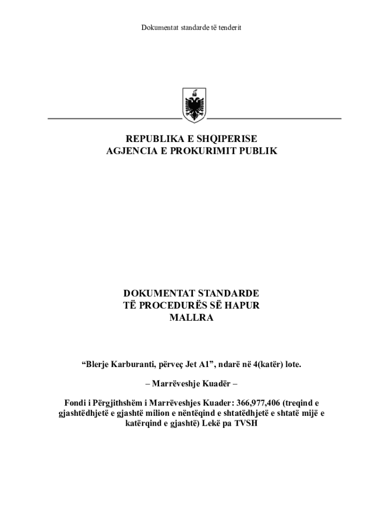 Dokumentat standarde t tenderitREPUBLIKA E SHQIPERISE AGJENCIA E PROKURIMIT PUBLIKDOKUMENTAT STANDARDE T PROCEDURS S HAPUR MALLRABlerje Karburanti, prve Jet A1, ndar n 4(katr) lote.Marrveshje KuadrFondi
