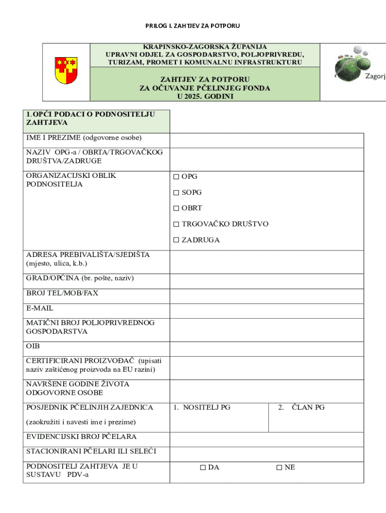 PRILOG I. ZAHTJEV ZA POTPORU KRAPINSKOZAGORSKA UPANIJA UPRAVNI ODJEL ZA GOSPODARSTVO, POLJOPRIVREDU, TURIZAM, PROMET I KOMUNALNU INFRASTRUKTURUZAHTJEV ZA POTPORU ZA OUVANJE PELINJEG FONDA U 2025.