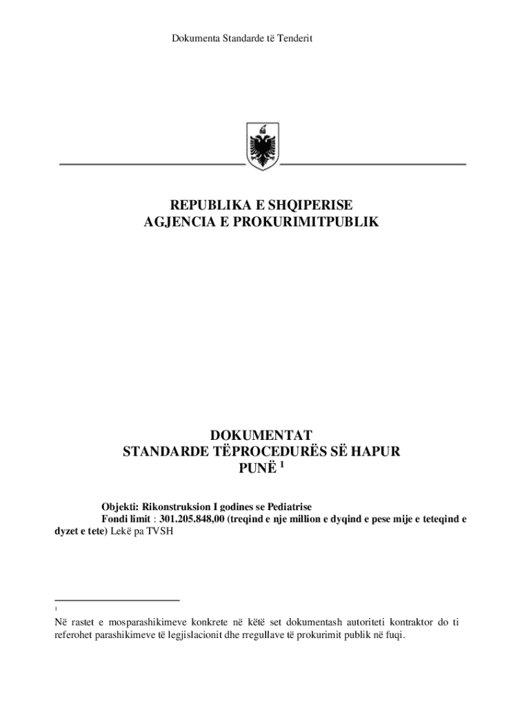 Dokumenta Standarde t TenderitREPUBLIKA E SHQIPERISE AGJENCIA E PROKURIMITPUBLIKDOKUMENTAT STANDARDE TPROCEDURS S HAPUR PUN 1 Objekti: Rikonstruksion I godines se Pediatrise Fondi limit : 301.205.848,00