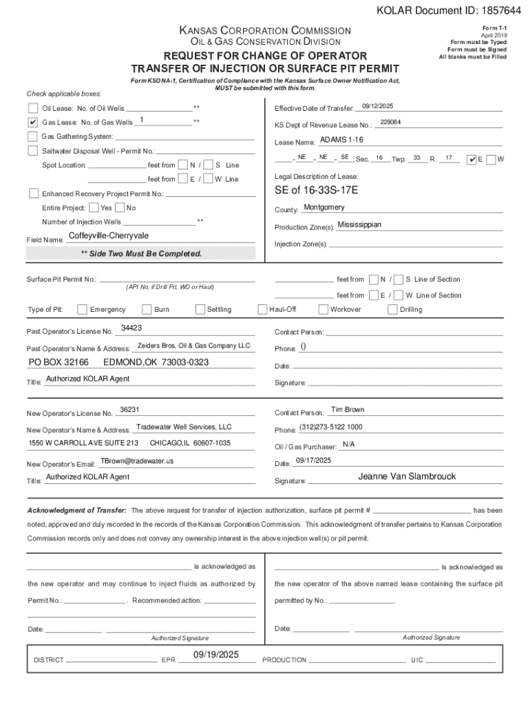 KOLAR Document ID: 1857644K ANSAS CORPORATION COMMISSIONForm T1 April 2019 Form must be Typed Form must be Signed All blanks must be FilledOIL & GAS CONSERVATION DIVISION REQUEST FOR CHANGE OF OPERATOR